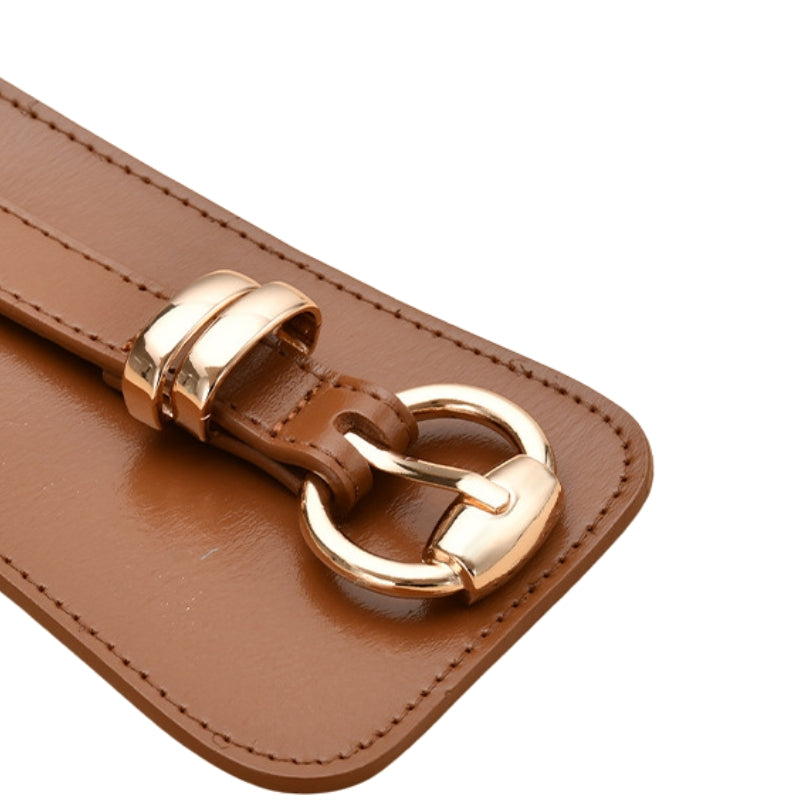 Réalisée en cuir de vachette fleur corrigée, la lanière offre un aspect lisse et homogène, renforcé par la texture 95T qui lui donne une bonne souplesse. Ce modèle se ferme avec une boucle ardillon en forme de cercle en alliage doré, apportant une touche lumineuse et féminine.