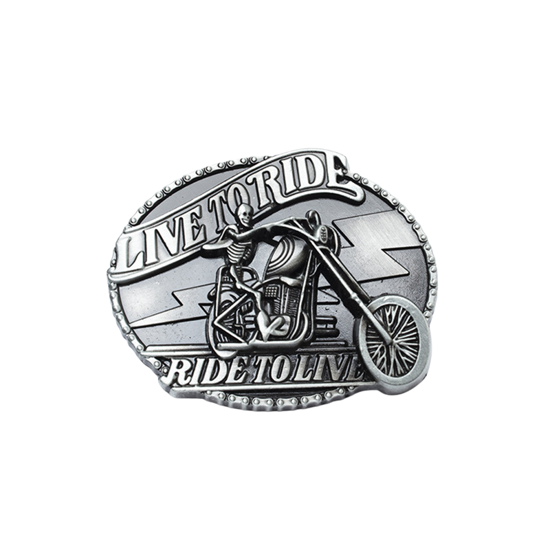 Sa particularité réside dans sa boucle à crochet de forme ovale, ornée d’un motif tête de mort sur moto, avec l’inscription emblématique "LIVE TO RIDE, RIDE TO LIVE". Conçue en alliage argenté, la boucle mesure 8,0 x 6,3 cm et pèse 77,2 g, affirmant une vraie présence.