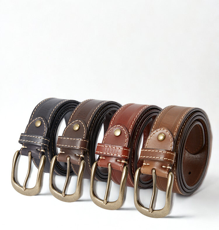 Large de 3,8 cm, cette ceinture convient parfaitement aux jeans et pantalons décontractés. Conçue pour durer, elle bénéficie d’un cuir traité pour éviter toute décoloration. Disponible en Bleu, Café, Chameau et Marron clair, et en longueurs allant de 100 cm à 125 cm.