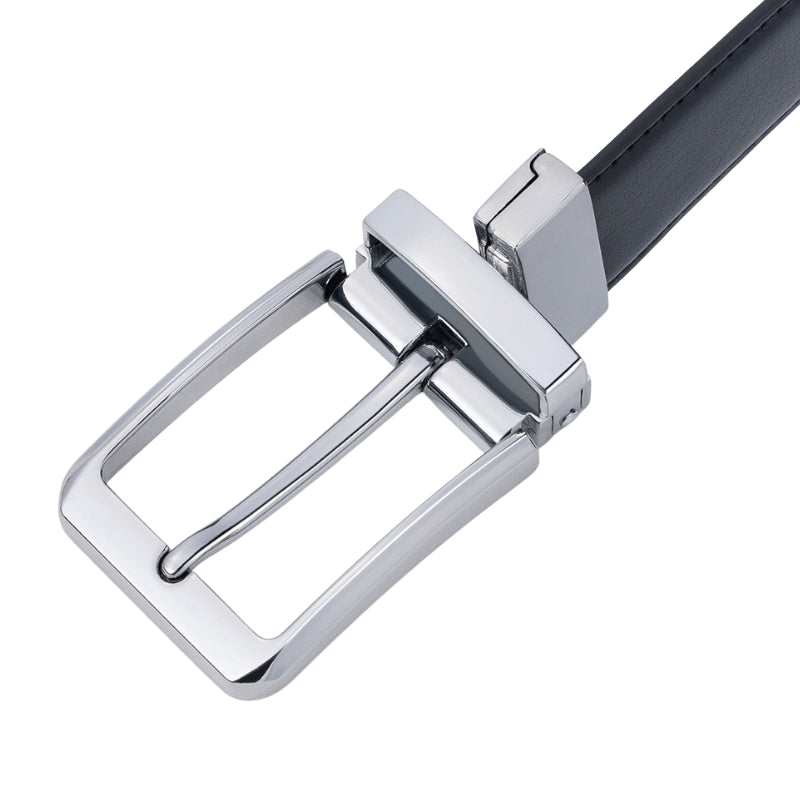 Elle est dotée d’une boucle ardillon rectangulaire en alliage, conçue pour résister à l’usure tout en conservant son éclat. Le mécanisme rotatif vous permet de changer instantanément la face visible de la ceinture, offrant une double teinte au choix. Ce système ingénieux en fait un accessoire deux-en-un à la fois pratique et raffiné.