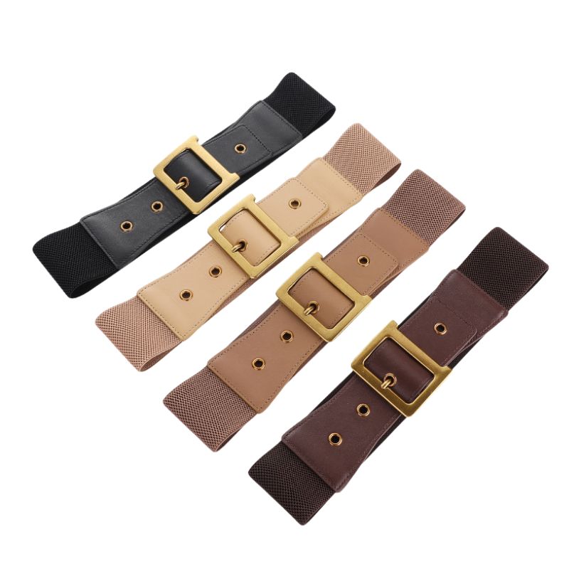 Sa boucle rectangulaire dorée à ardillon, associée à une série d’œillets métalliques, assure un maintien précis tout en ajoutant une touche brillante à l’ensemble. Ce système de fermeture est à la fois fonctionnel et décoratif, parfaitement adapté aux tenues ajustées et habillées.