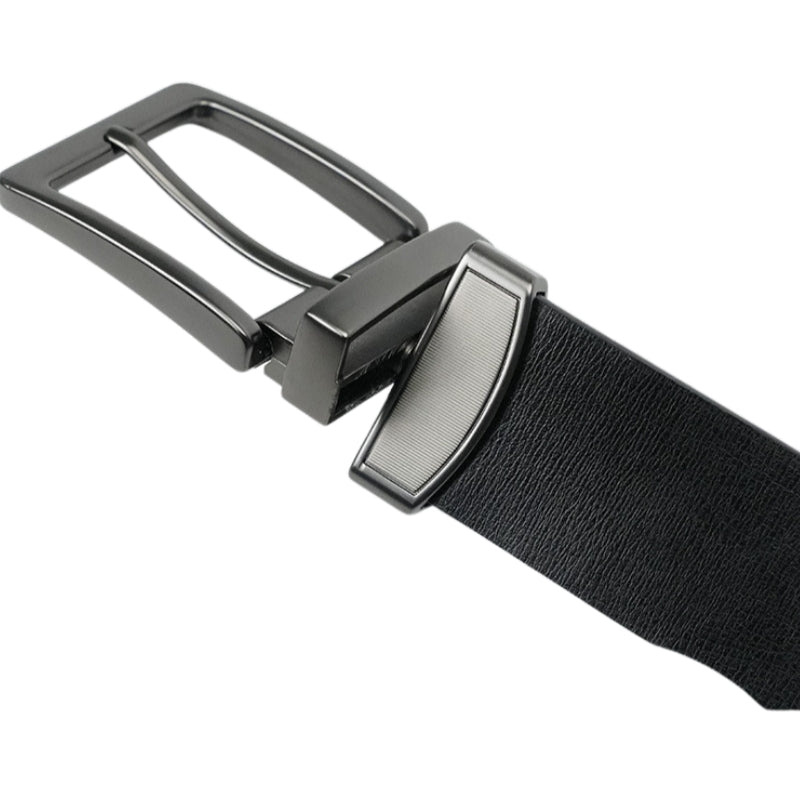 Elle est équipée d’une boucle ardillon rectangulaire en alliage, avec une finition noire satinée, qui accentue son allure moderne. Grâce à son système de rotation, elle devient réversible, permettant de passer du noir au café selon vos envies. Ce double usage en fait un accessoire pratique pour passer d’un look professionnel à un style plus décontracté.