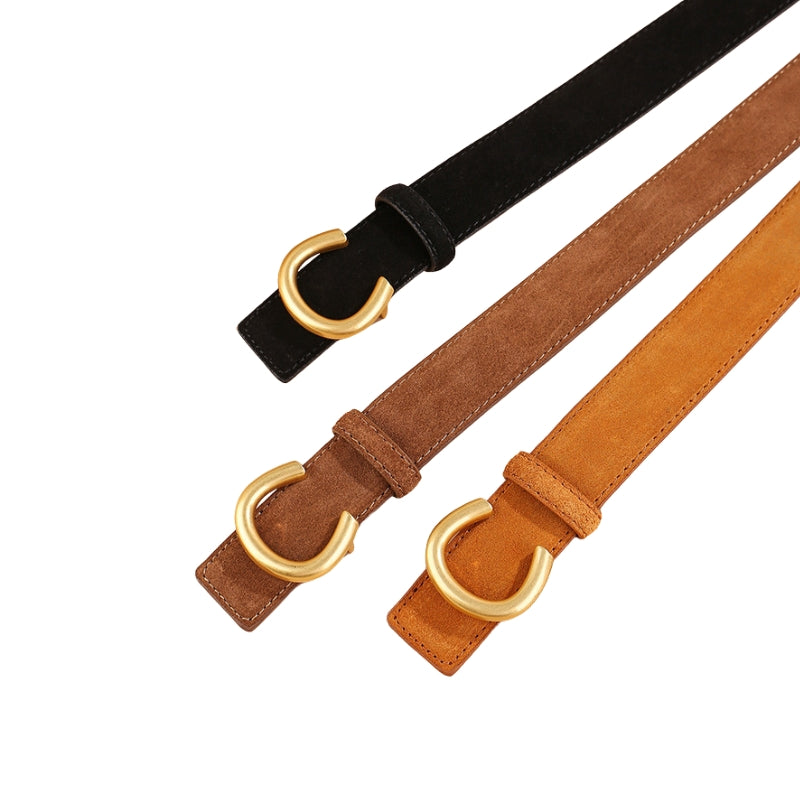 Une ceinture au design minimaliste en cuir suédé mat, parfaite pour les silhouettes féminines.