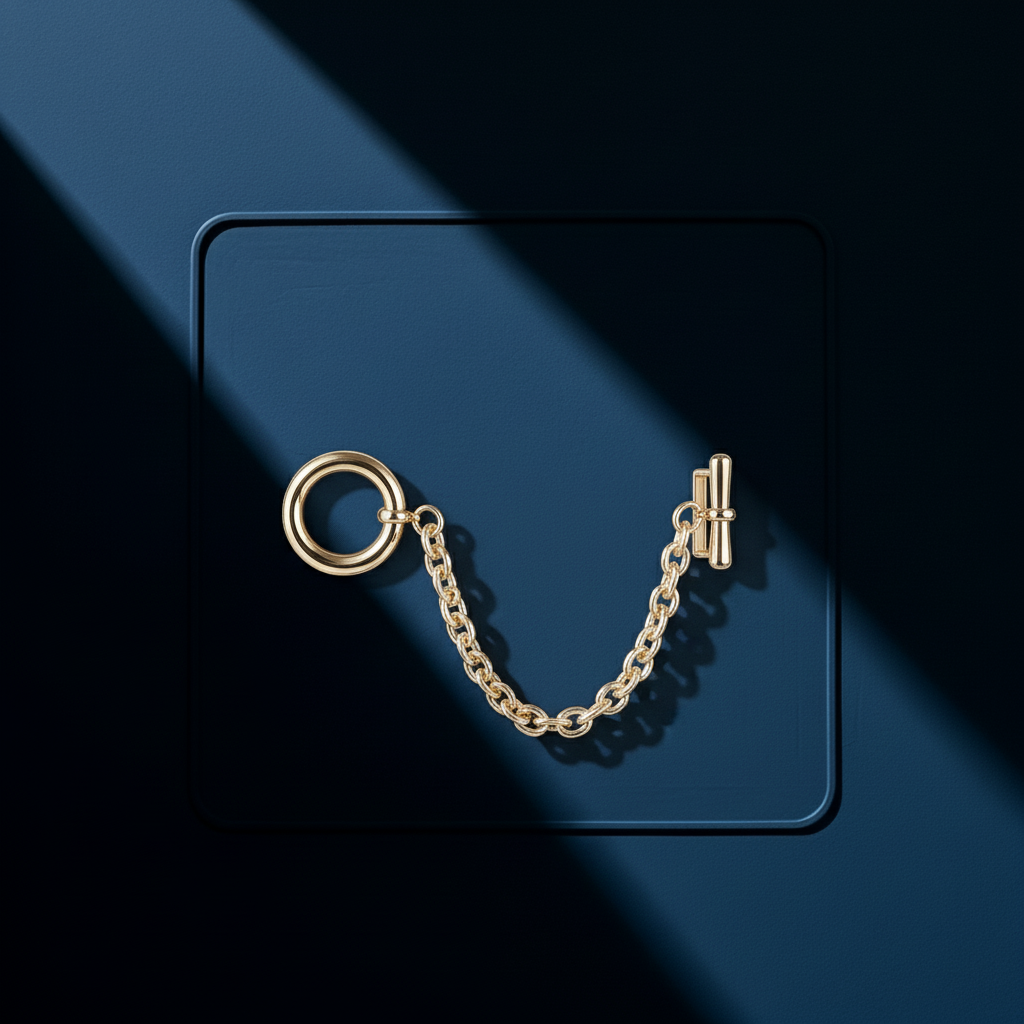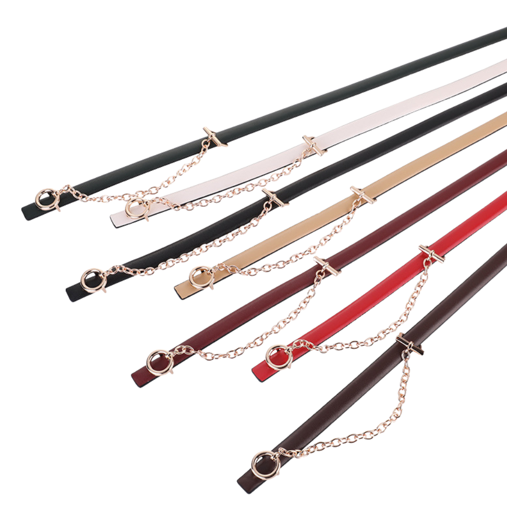 Sans boucle traditionnelle, elle se ferme à l’aide d’un système de fixation plate type T-bar, dissimulant habilement la fermeture pour un rendu minimaliste et élégant. Une chaînette décorative en métal doré vient subtilement rehausser l’ensemble, apportant une touche de féminité moderne. La boucle ronde en alliage doré assure une fixation fiable et esthétique.