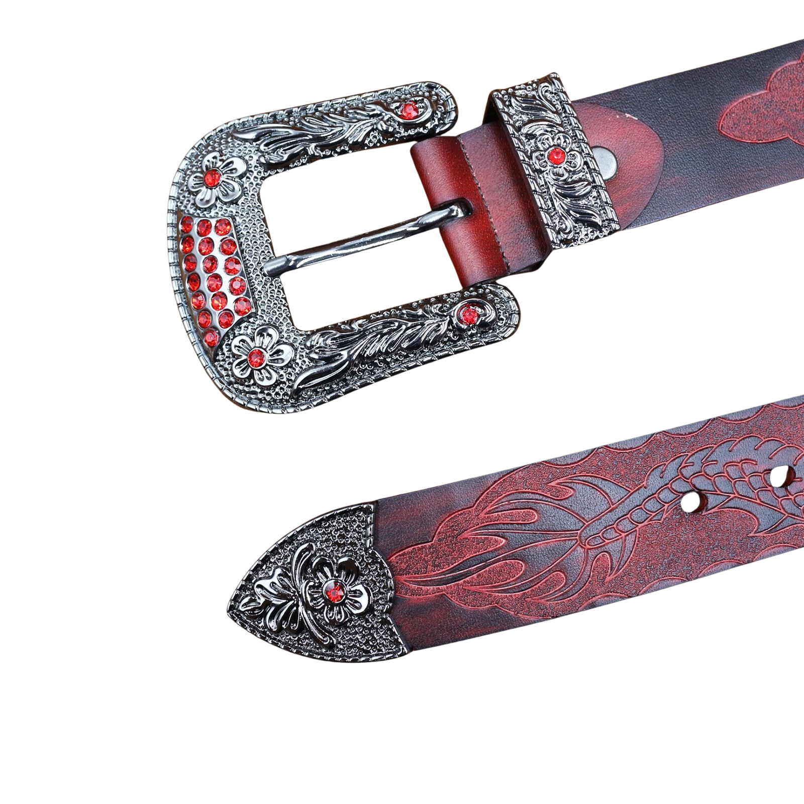 La boucle ardillon de forme arrondie, en alliage finition argentée, est ornée de strass floraux et gravée de motifs dragons, apportant une touche à la fois mystique et sophistiquée. Disponible en trois coloris expressifs, noir, jaune et bordeaux, cette ceinture s’adapte à plusieurs styles vestimentaires et se règle manuellement selon la longueur choisie (105 cm, 115 cm ou 125 cm).