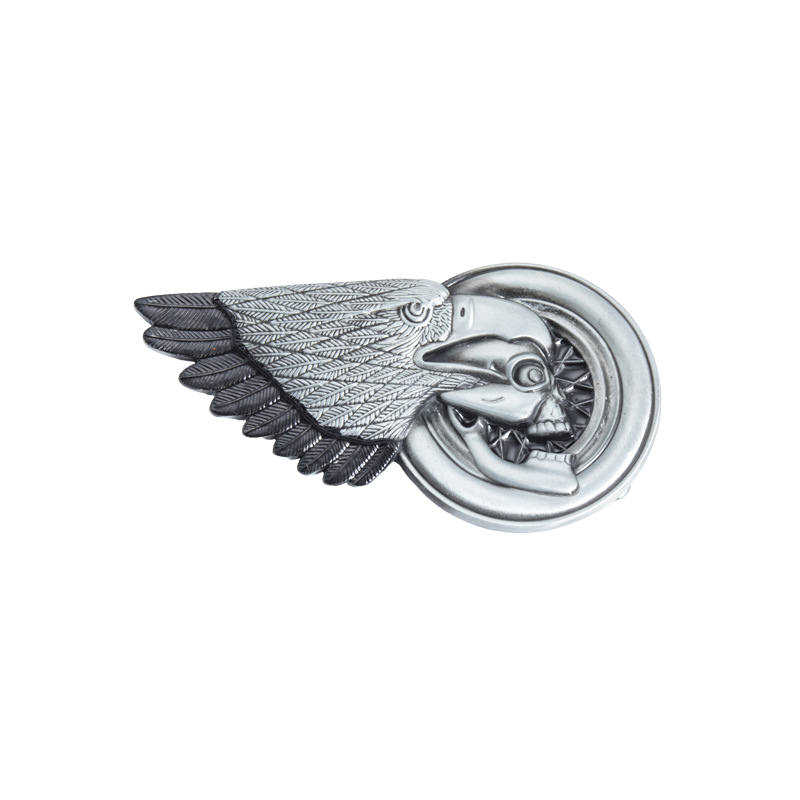 Sa boucle en alliage argenté est sculptée en forme d’aigle associé à une roue de moto, un symbole de liberté et de force. Avec ses dimensions de 12,6 x 6,8 cm et son poids de 76,2 g, elle affirme son caractère imposant sans perdre en confort.