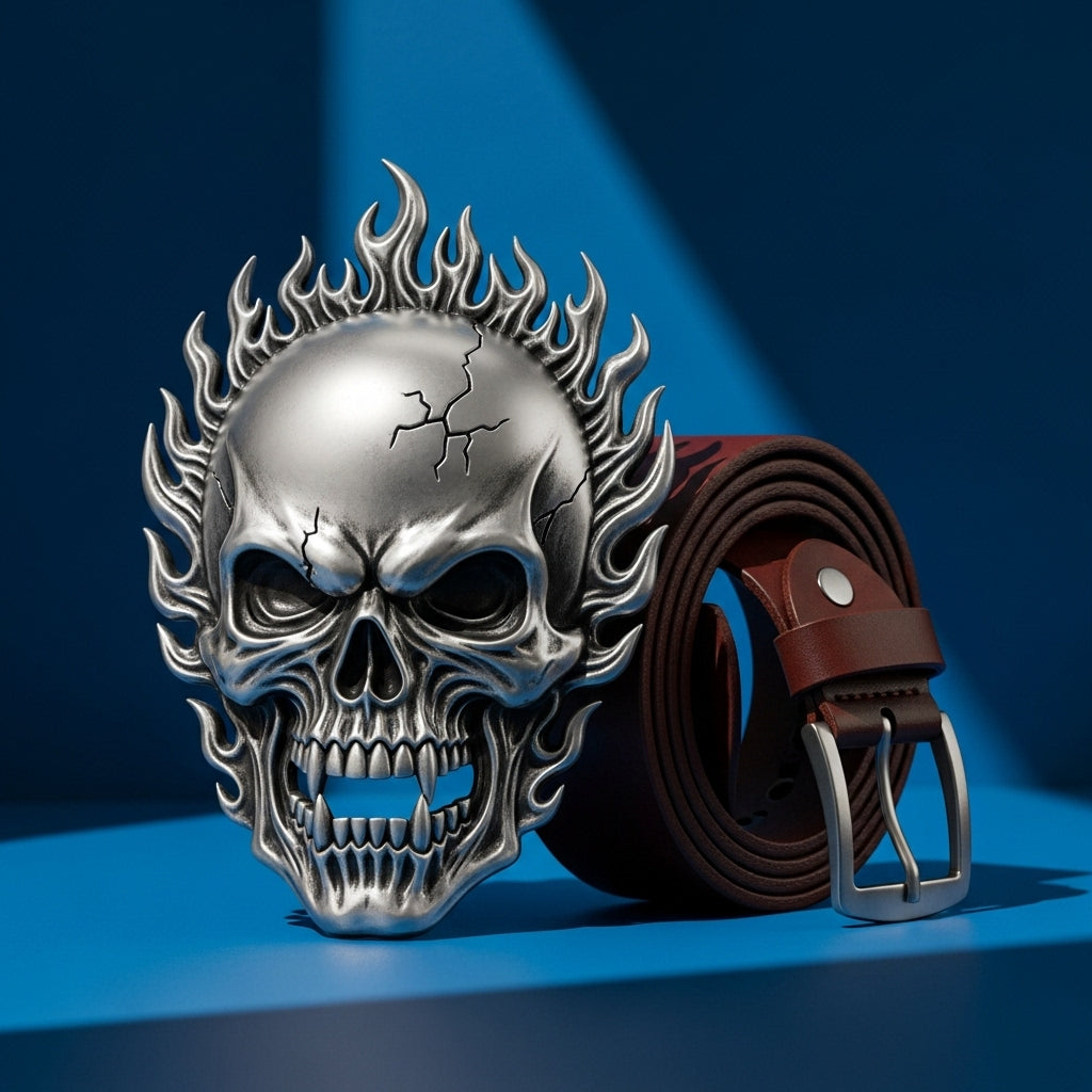 Affirmez votre style avec la ceinture homme à boucle tête de mort, un accessoire audacieux qui symbolise force et originalité. Sa boucle imposante au design détaillé apporte une touche rebelle et rock à vos tenues.