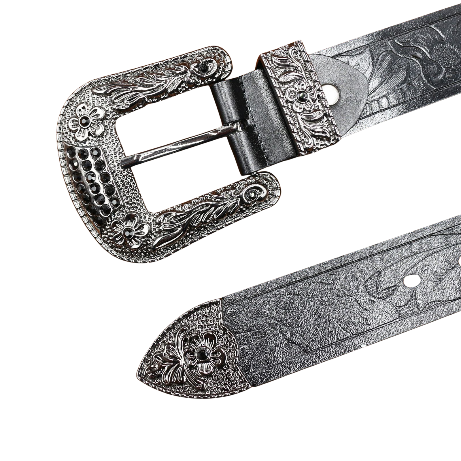 Adoptez un look puissant avec la ceinture Loup Noir en cuir refendu texturé. Sa boucle ardillon décorée de strass colorés affirme votre caractère.