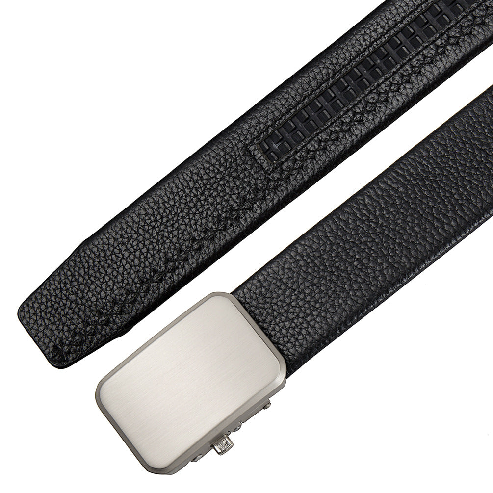 Ceinture en cuir texturé pour homme, à boucle automatique sans trou. La lanière en cuir de vachette refendu, pigmenté et résistante, présente une finition décorative soignée. Boucle rectangulaire lisse en alliage, au look moderne et élégant. Ajustable de 110 à 130 cm, elle s’adapte à tous vos styles. Idéale pour le bureau comme les sorties habillées.