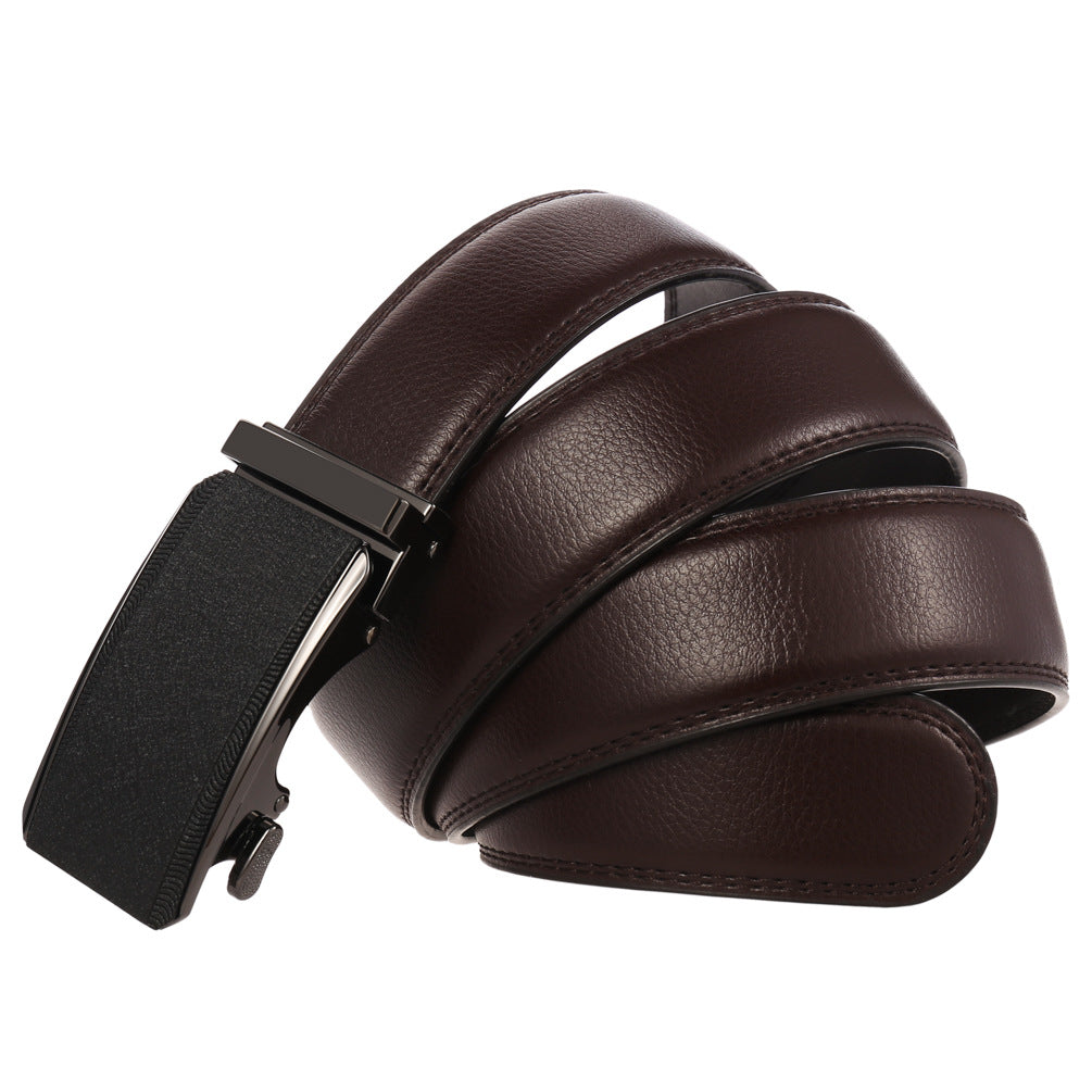 Ceinture homme en cuir texturé noir ou marron avec boucle grainée mate. Système automatique sans trous pour un confort réglable. Largeur de 3,5 cm, longueur ajustable de 110 à 130 cm. Pour look casual ou habillé. Élégance discrète et pratique.