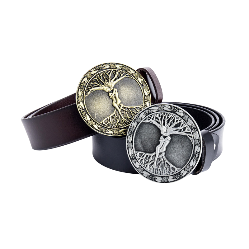 Sa largeur de 3,8 cm assure une présence affirmée, parfaite pour les looks décontractés. La pièce maîtresse : une boucle à crochet en alliage doré ou argenté, de forme ronde, représentant un arbre de vie finement sculpté.