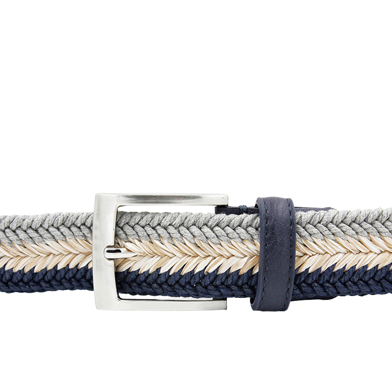 Apportez une touche de style décontracté à votre tenue avec la ceinture RobinTan pour homme, conçue en paille tressée résistante. Sa lanière multicolore (bleu, beige et gris) d’une largeur de 3,4 cm offre un look casual parfaitement adapté aux tenues estivales ou relax.