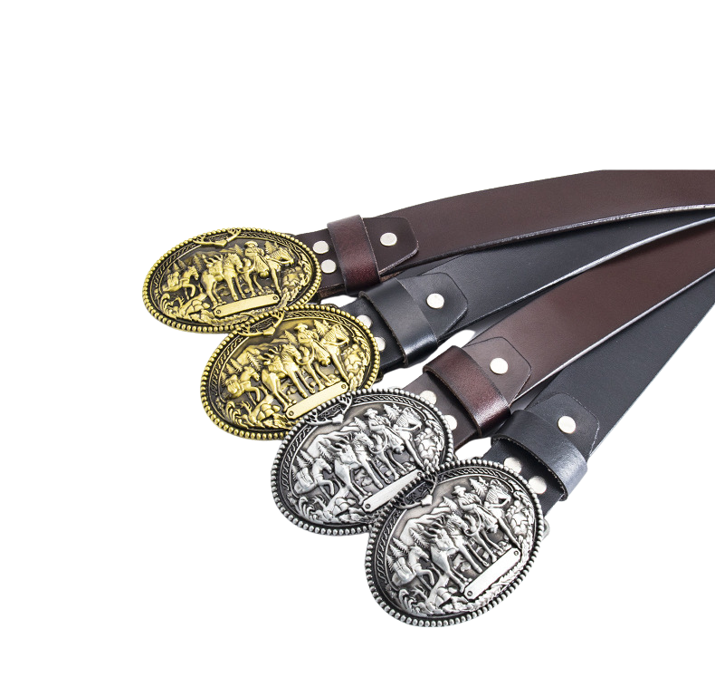 Son atout majeur est sa boucle ovale en alliage, finement décorée d’un motif de cavalier et chevaux en doré et argenté, symbole de puissance et d’aventure. Avec ses dimensions de 9,0 x 6,6 cm et son poids de 72 g, elle attire le regard sans alourdir la ceinture.