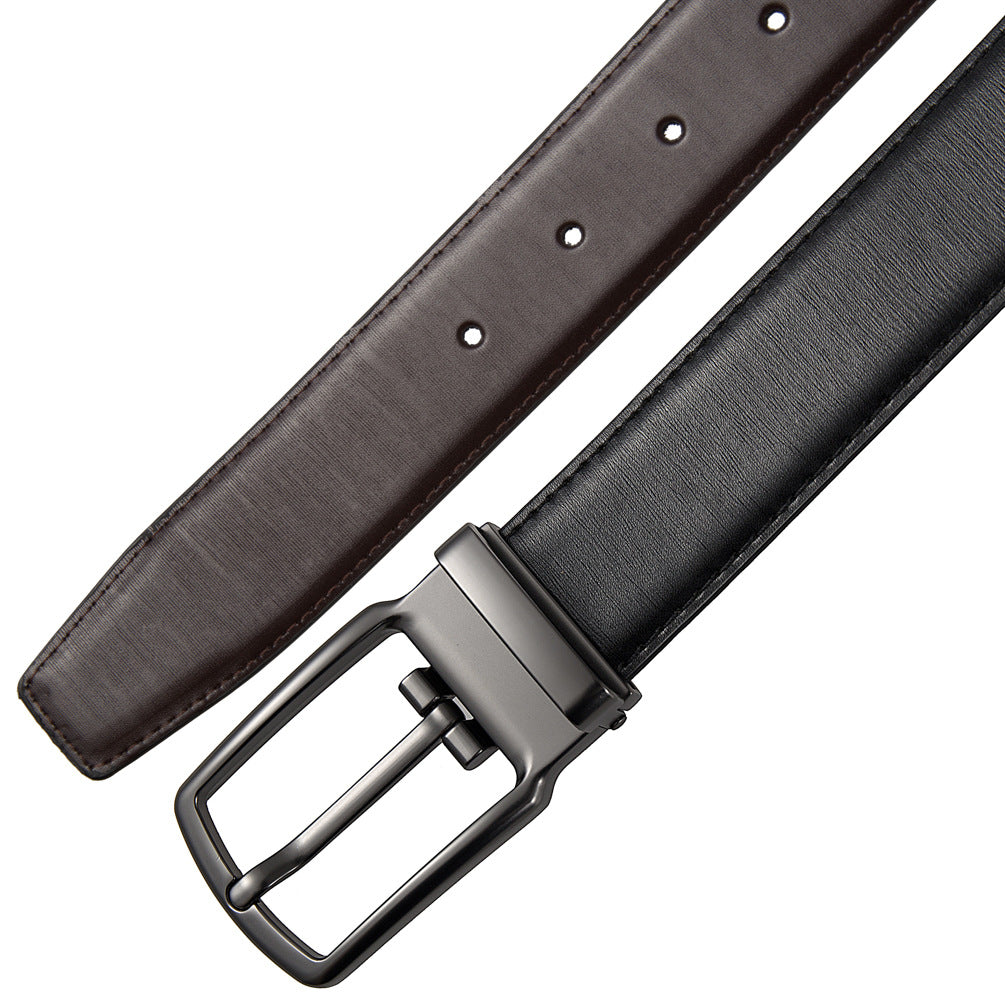 Cette ceinture homme en croûte de cuir de vachette pigmentée présente une lanière lisse (95T) pour un rendu sobre et élégant. Son design double face, noir d’un côté et café de l’autre, offre une adaptabilité immédiate à toutes les tenues, du jean au pantalon habillé.