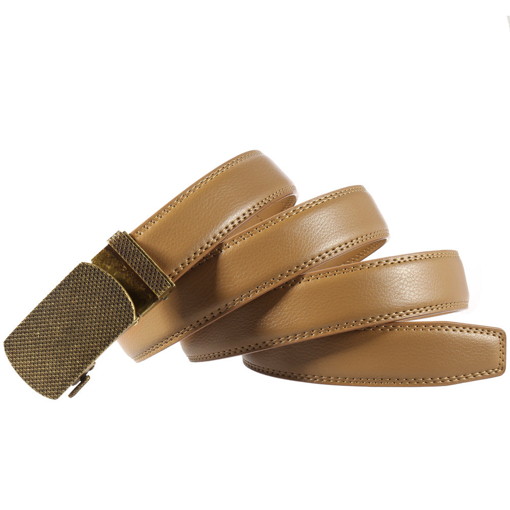 Ceinture homme en cuir refendu avec lanière texturée. Boucle automatique rectangulaire en métal à finition vintage décorative. Largeur fine de 3,1 cm, longueur réglable de 110 à 130 cm. Existe en noir, marron clair et beige. Idéale pour un look chic ou décontracté.
