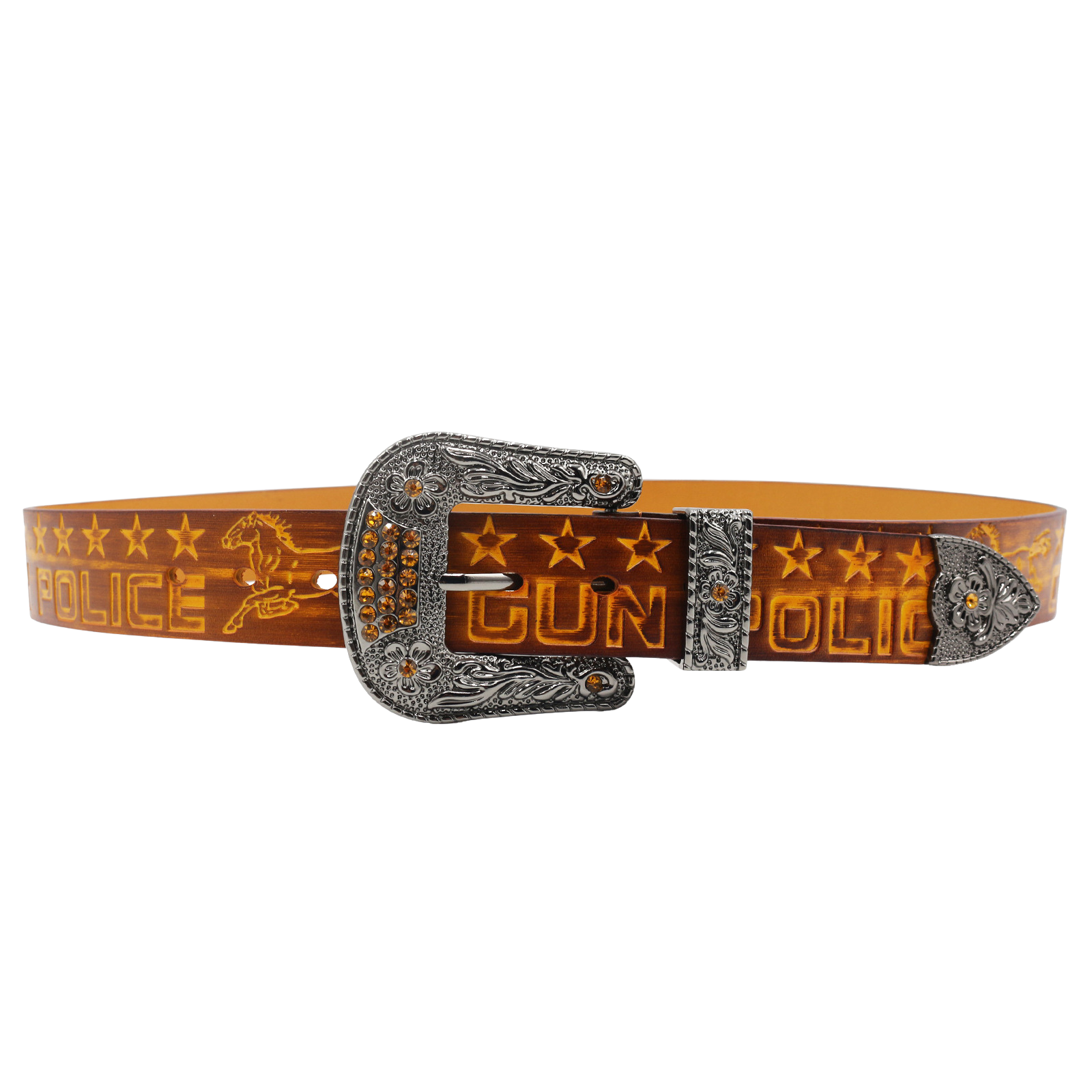 La boucle ardillon arrondie en alliage, finition argentée, se distingue par son motif "GUN POLICE" gravé en relief, accompagné de strass décoratifs qui captent la lumière avec subtilité. Cette alliance de matières robustes et de détails visuels audacieux fait de Zadig un choix parfait pour accompagner aussi bien un jean casual qu’un pantalon habillé.